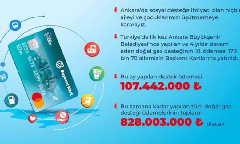 10’uncu ödemesi gerçekleştirilen doğal gaz desteği kapsamında toplamda 179 bin 70 ailenin Başkent Kart’ına hane başına 600 TL olmak üzere; 107 milyon 442 bin TL olarak yatırıldı.