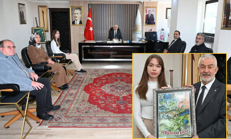 Gelir İdaresi Başkanlığı tarafından düzenlenen Türkiye geneli Vergi Konulu Resim Yarışmasında, Türkiye 2.’si olan Şehit Polis Mehmet Karacatilki Bilim ve Sanat Merkezi 11. sınıf öğrencisi Nisa Ceylin Falay, beraberinde anne ve babası Fadime-İbrahim Falay, Merkez Müdürü Faruk Abdullah Özcan ile Danışman Öğretmeni Alaettin Çevikbaş ile birlikte, Belediye Başkanı Şükrü Başdeğirmen’i ziyaret etti. Ödülü geçen hafta Türkiye Cumhuriyeti Hazine ve Maliye Bakanı Mehmet Şimşek tarafından verilen 11. sınıf öğrencisi Nisa Ceylin Falay, yarışmaya ilişkin Belediye Başkanı Şükrü Başdeğirmen’e bilgi verdi. Falay, kendisine Türkiye 2.’liği getiren resim çalışmasında fikir olarak ruloyu ve rulo üzerine para resmettiğini söyledi. Falay, “Paranın geçtiği yerler, halkın desteği ile beraber güzelleşiyor şeklinde bir tema işledim. Aldığım bu dereceden dolayı çok mutluyum” dedi.