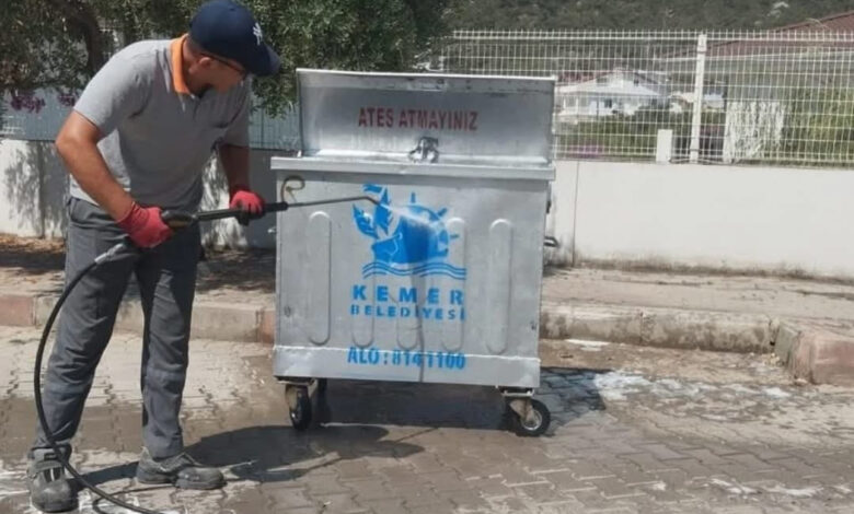 Kemer’in tüm mahallelerinde yoğun şekilde temizlik çalışmalarına devam eden belediye ekipleri, rutin olarak yaptığı mıntıka temizliğinin yanı sıra çöp konteynerlerini de yıkadıktan sonra dezenfekte ediyor.